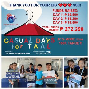 A BIG THANK YOU, XIE XIE and SALAMAT to the SSC Community for taking the call to action in helping the families affected by the recent Taal Eruption. In just three days, CASUAL DAYS for TAAL (a fundraiser) amassed a total of Php 272,290! That is 81% more than the initial target of Php 150,000, which we turned over to World Vision this morning. We also would like to express gratitude to the S3 Global Perspectives Class and Teacher Zen for spearheading this campaign. A true example of translating the SSC Mission Statement into Action!