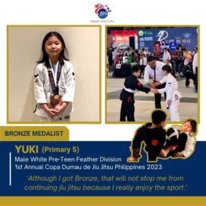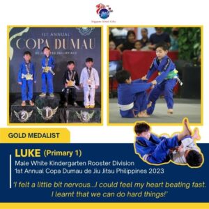 Congratulations to Luke, Santi, Yuki and Kyle – for a brave performance in the 1st Annual Copa Dumau de Jiu Jitsu Philippines 2023 held in Robinsons Galleria Cebu last 21 Oct 2023! Brazilian Jiu-Jitsu, the ‘gentle art’, is a martial art and combat sport that allows a person to successfully defend themselves against a larger, stronger attacker. Getting on the mat takes guts, and remembering the techniques takes discipline, calm and focus. Job well done, SSCians! Keep it up and always remember: #sscWeCanDoHardThings!